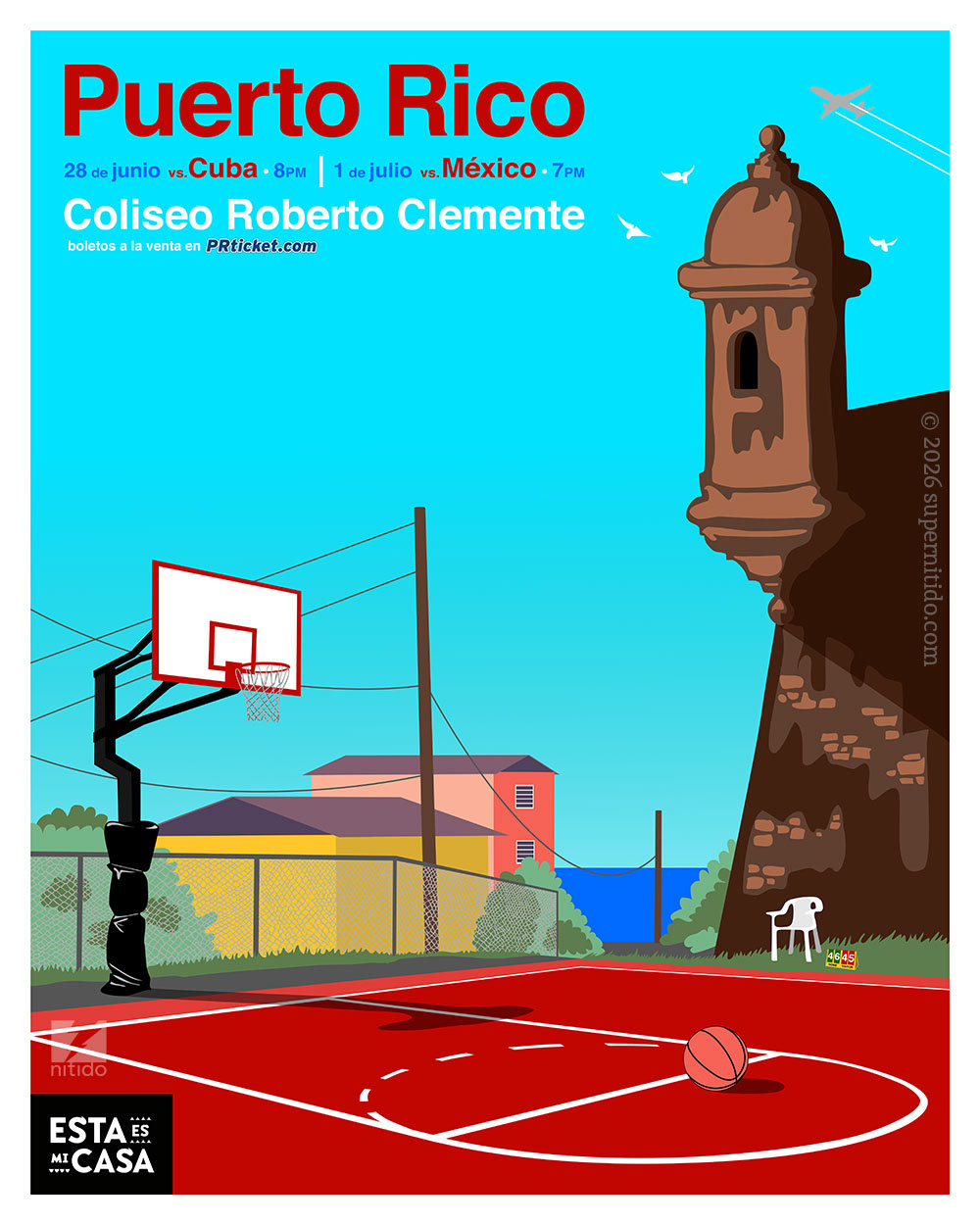 This colorful yet solemn view of La Perla's famous basketball court –no players– was meant to convey how Puerto Rico felt after Hurricane María. The scoreboard honors the dead after the catastrophic storm, in defiance to the numbers provided by the government. Up high in the distance another plane leaves the island...