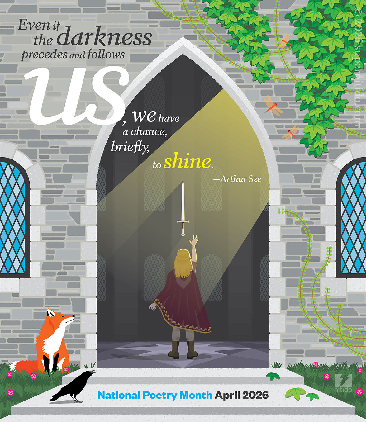 The official 2026 National Poetry Month poster marks the thirtieth anniversary of National Poetry Month. The poster features original artwork by Puerto Rican artist Alfredo Richner and an excerpt from “The Chance” by Arthur Sze, Chancellor Emeritus of the Academy of American Poets and the twenty-fifth United States Poet Laureate, 2025–26. The excerpt reads, “even if the darkness precedes and follows / us, we have a chance, briefly, to shine.”