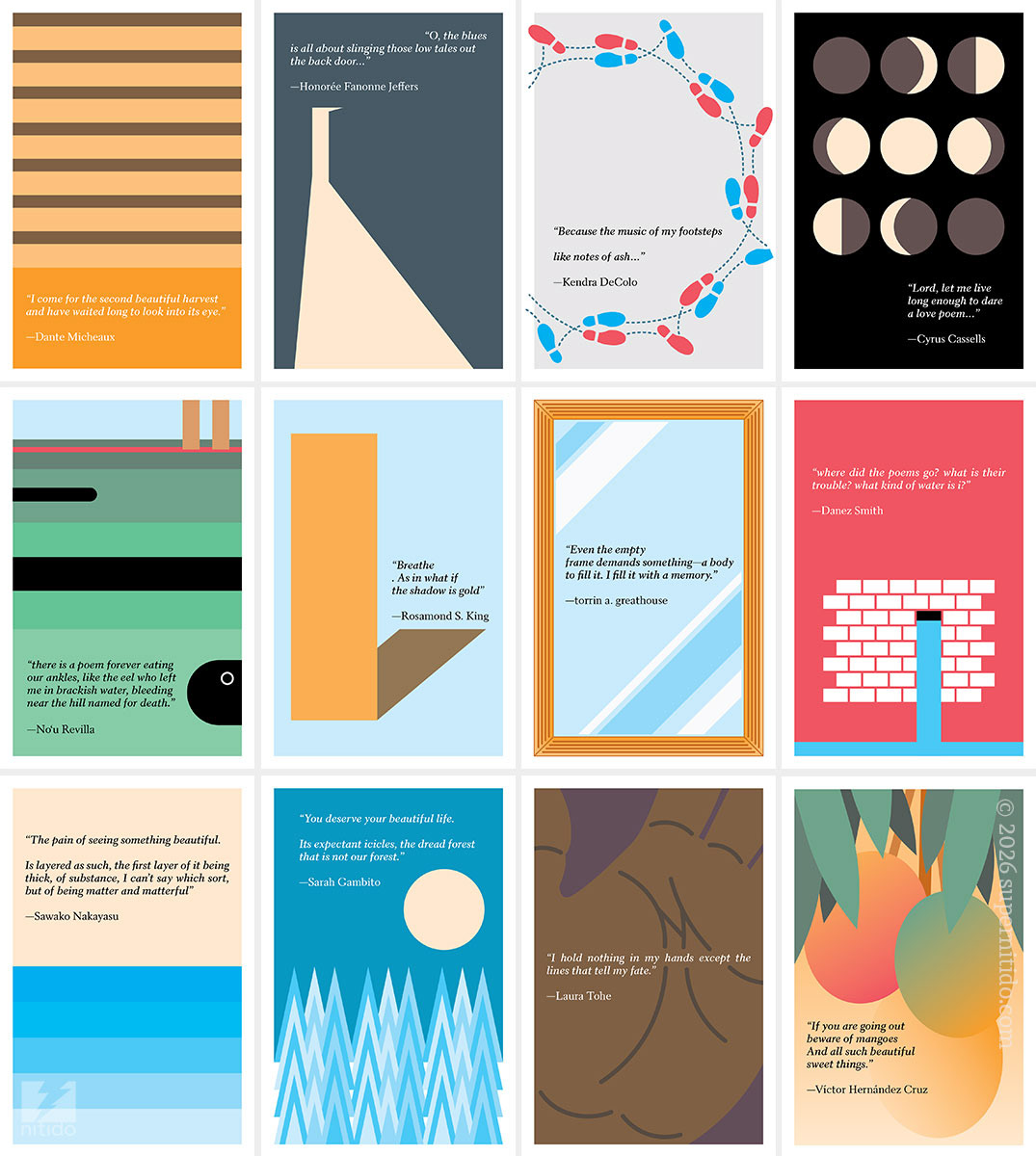 Since this was a bit of a departure / experiment for the Academy and with time being of essence, I was given under a week to come up with the designs –an exhilarating few days that ended up rekindling my passion for poetry and pushing me to work from instinct (and more abstractly). Of special significance to me is the last poem excerpt, by poet and fellow Puerto Rican, Victor Hernández Cruz, which reminded me of my late grandmother's mango paintings that still adorn our house in San Juan.
